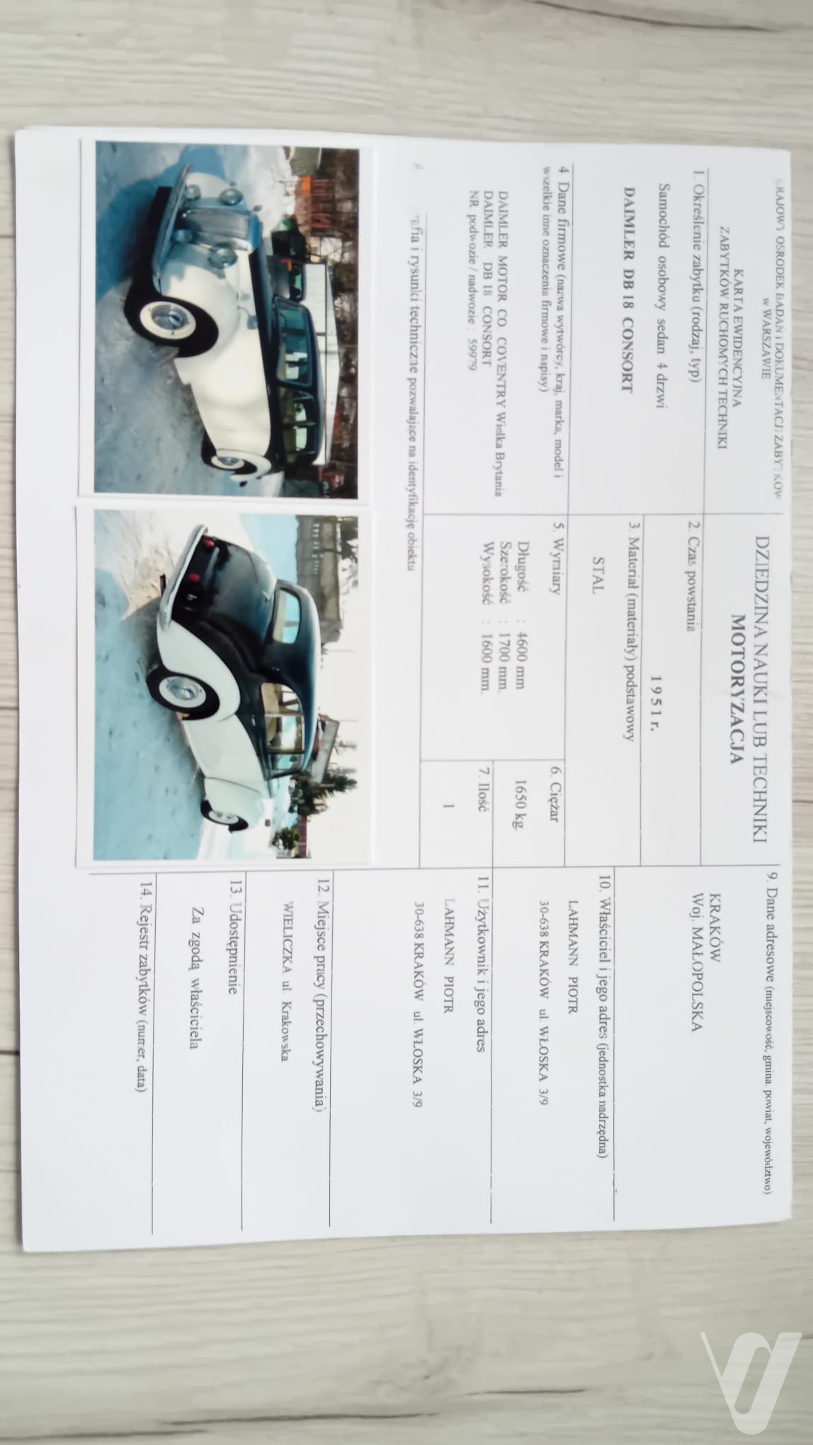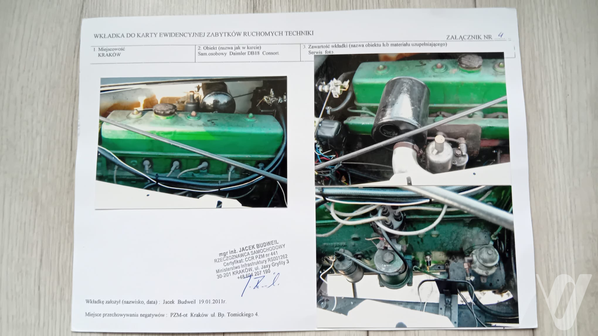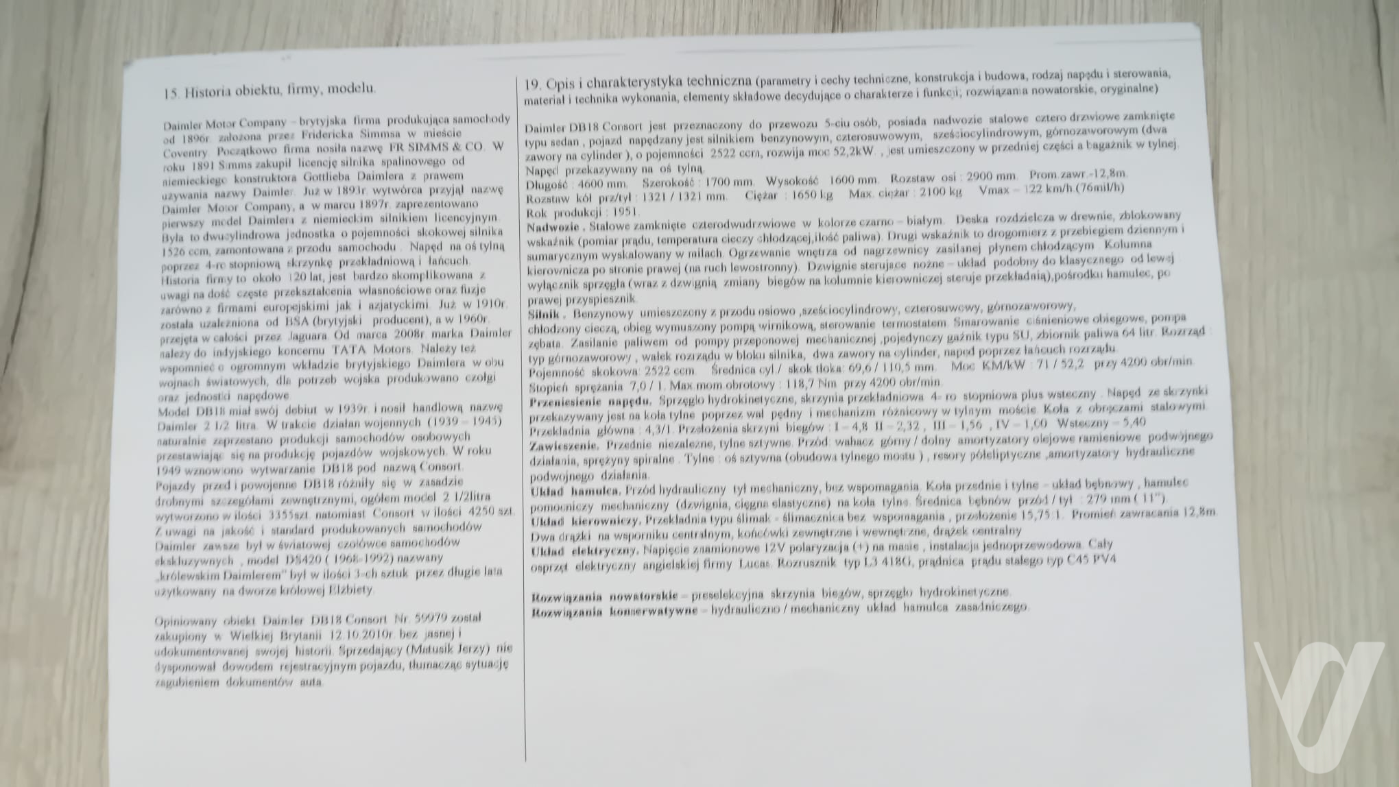 Do pojazdu dołączony jest szczegółowy opis przygotowany przez rzeczoznawcę samochodów zabytkowych, potwierdzający jego stan oraz wartość kolekcjonerską.